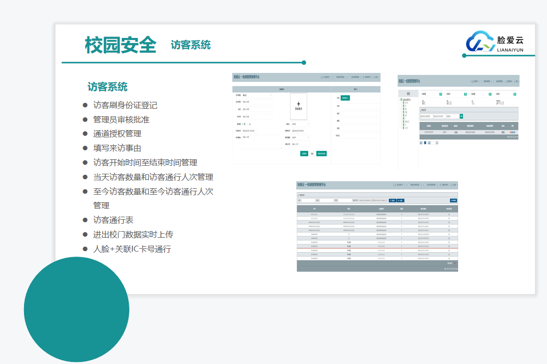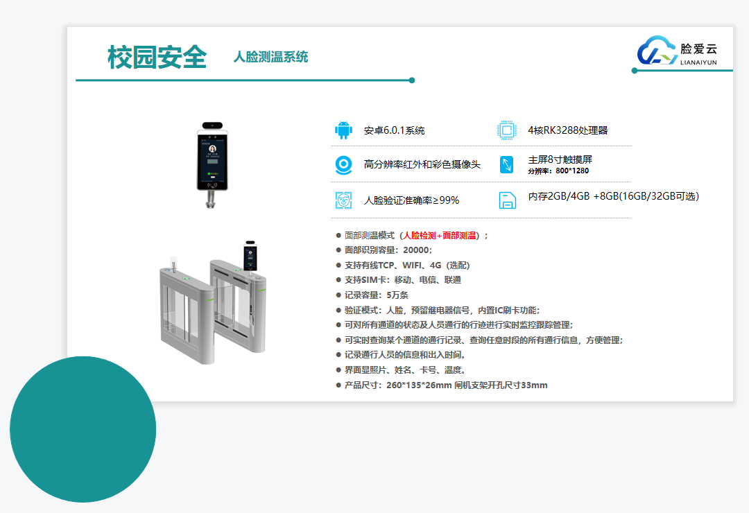 校門口:安裝智能人臉識別閘機、訪客機、和抓拍機,對出入人員進行人臉身份識別和大數(shù)據(jù)分析,充分考慮訪客系統(tǒng)和人員出入控制的結(jié)合,實現(xiàn)人臉身份驗證、出入管理、學生請假管理、簽到考勤等系列功能,滿足校園場景綜合管理的需求。