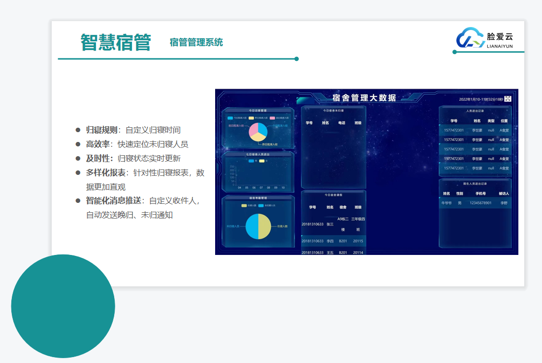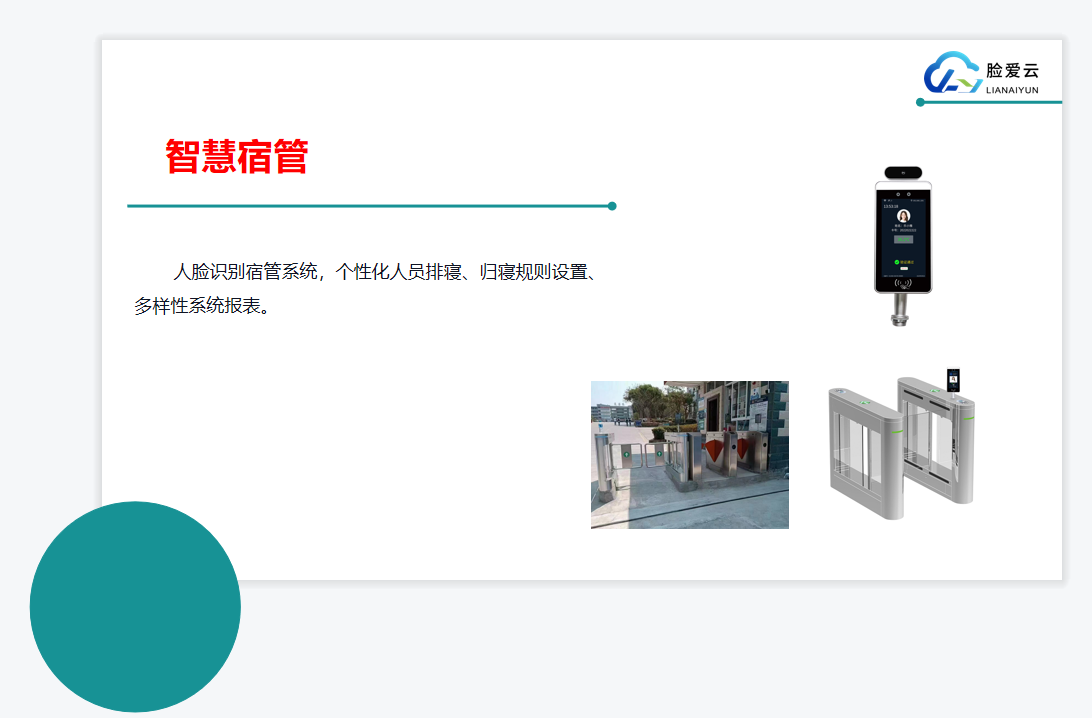 1.人臉識(shí)別宿管系統(tǒng),個(gè)性化人員排寢、歸寢規(guī)則設(shè)置、多樣性系統(tǒng)報(bào)表。