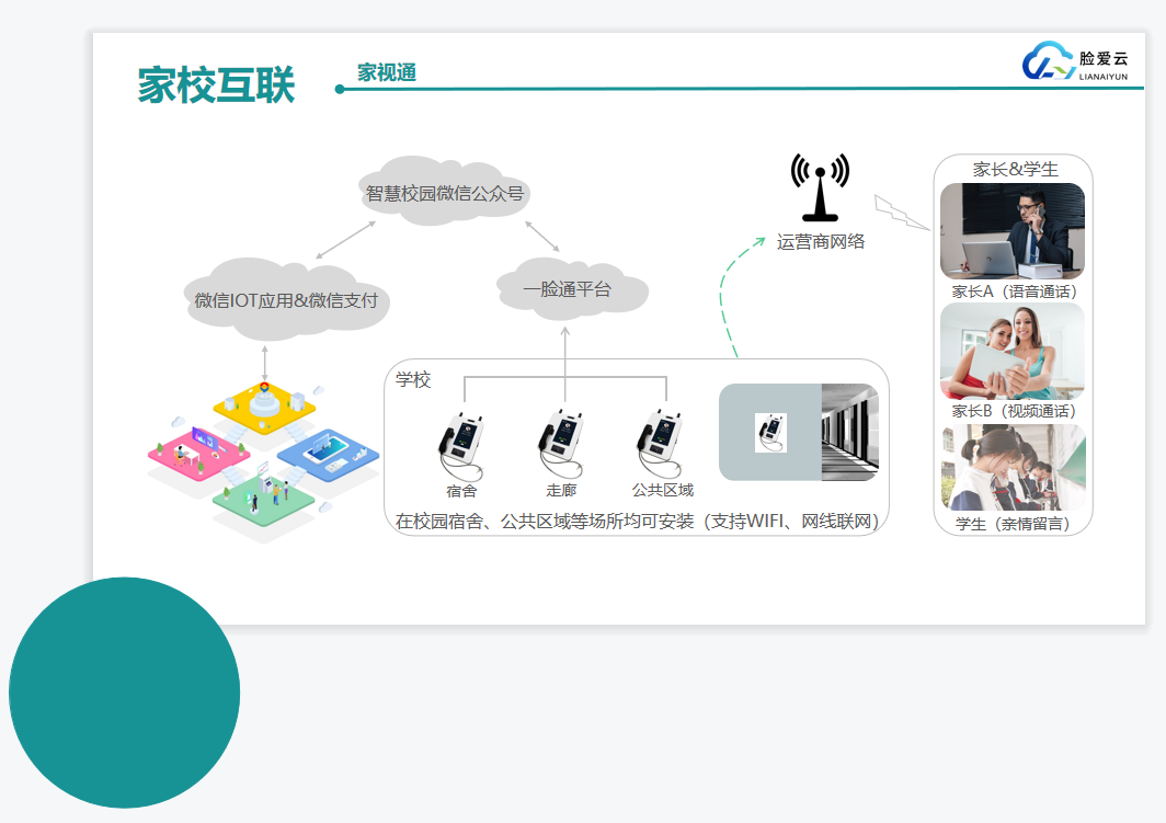建立學(xué)校、家長(zhǎng)互聯(lián)溝通平臺(tái),家視通可視電話、家長(zhǎng)可遠(yuǎn)程給孩子充值、查詢消費(fèi)記錄、掌握門禁通行記錄、宿舍歸寢管理。